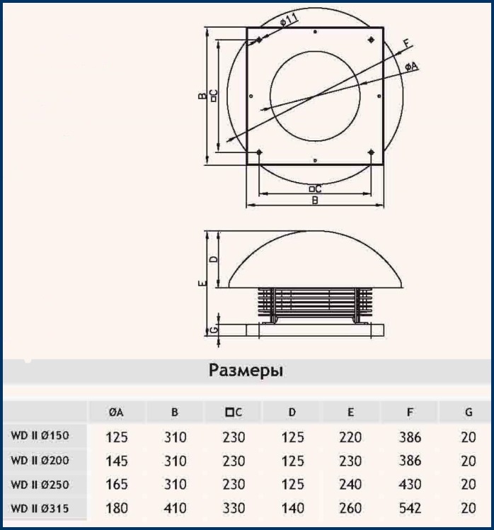 Вентилятор оборудован двигателем на шариковых подшипниках и колпаком, который защищает от попадания атмосферных осадков внутрь вентилятора и системы.